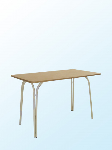 металлокаркас состоит из двух пар дуг сваренных в области ножек из трубы диаметром 22 мм и окрашен порошково-полимерной краской. Столешница изготовлена из ДСП с пластиковым покрытием, цвет бук, углы закруглены, торцы облицованы кромкой ПВХ 2 мм
