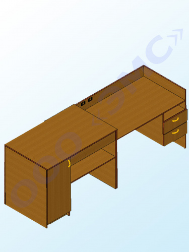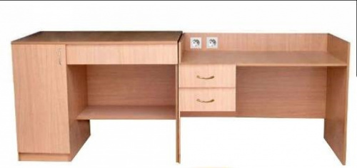 один стол имеет отделение с дверцей и полку под столешницей. Второй стол имеет тумбу с двумя ящиками на роликовых направляющих и открытую нишу, на этом столе установлены розетки наружные с изолированным основанием. Столы изготовлены из ЛДСП и облицованы кромкой ПВХ 0,4 мм. Столешницы столов с пластиковым покрытием и облицованы кромкой ПВХ 2 мм