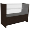 Материал: ламинированный ДСП 16 мм, кромка ПВХ 0,4 мм и 2 мм, стекло - перед 4 мм, полки и верх 5 мм. Витрина имеет два назначения. Она одновременно и прилавок, на котором можно выдавать товар, и витрина, в которой можно выложить весь ассортимент продукции. Имеет увеличенную демонстрационную часть. Плюс большой в том, что товар находится в выгодном месте, не заметить его невозможно. Две полки хорошо подойдут для товара среднего размера.